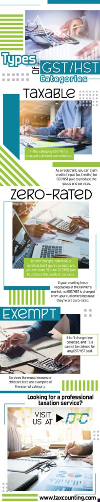 Here are the different types of GST/HST categories present. For more details have a look at the infograph below: